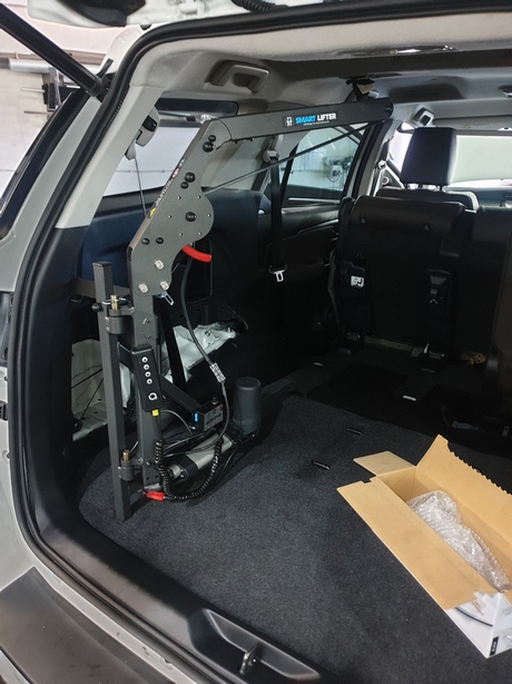 To unload, the cover slides open over the driver’s door and the winch lowers the foldable wheelchair. The lifting capacity is 20kg. Unit weights 56kg.