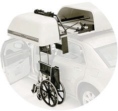 A roof-mounted wheelchair carrier and winch with fiberglass, weatherproof cover.